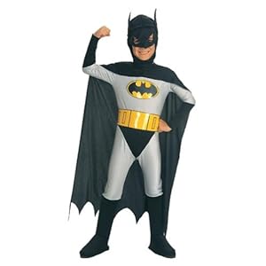 Your child can now be the Caped Crusader. Includes- Headpiece, cape, jumpsuit with attached boot tops and belt. Comic book version. Polyester. Small 4-6.