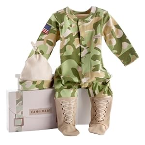 Whether he just plays with toy soldiers or he's going to love a good hunt with his Dad, dress your Little Trooper in this preciously comfortable Camo Baby sleeper from Baby Aspen. Clever faux boots keep tootsies warm and is made of 100% lusciously soft cotton in baby-soft mock camouflage colors. Tiny toes stay snugly- warm inside the unique lace-up boot-inspired feet Newborn size 0-6 month sleeper comes with a cradle-soft cap with a camo topknot.Legs have secure snap closure for easy changes between "maneuvers" Fully opened, the exclusive packaging design creates its own unique showcase. Clever, backpack-style camo box unfolds to display product hanging from a sturdy, custom-designed hanger. Folded up, the box creates its own gift wrap suitcase! Box measures 9 .25"w x 6"t x 2" d folded, opening to a display size of 9 .25" w x 15" t x 2" d with sturdy custom hanger.